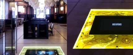 Herzlich willkommenzu Ihren Füssen. Dem Einsaz der Monitore von adnotam im Spiegel bzw Glas sind