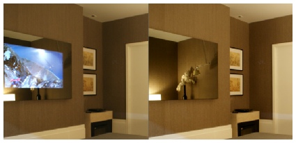 Adnotam TV Geräte werden eingebaut in eine Wohnzimmerschrankwand oder Schiebetür. Die Anschlüsse für Spieleboxen und Audiogeräte sind gut erreichbar unter den Bildschirmen angebracht.